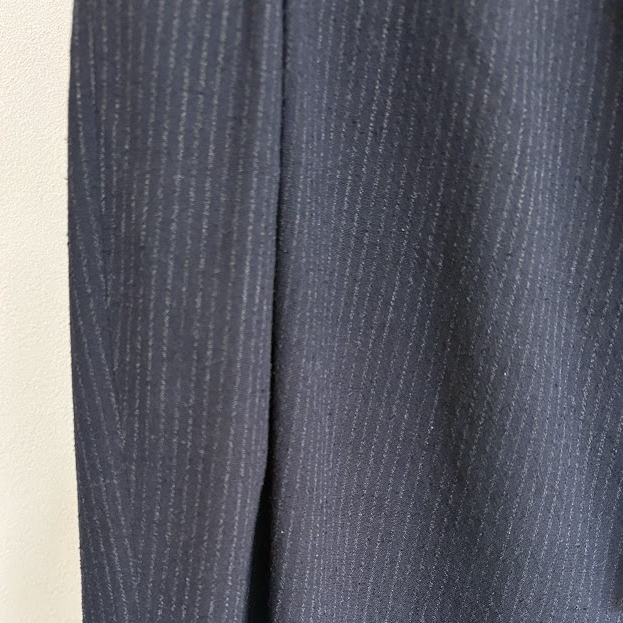 素材はシルクとウールで作られていているので、シルエットとも合わさり、非常に品の良さを感じるスラックスになっています。一見無地に見えますが、よくよく見るとピンストライプの生地になっており、アクセントにもなっています。