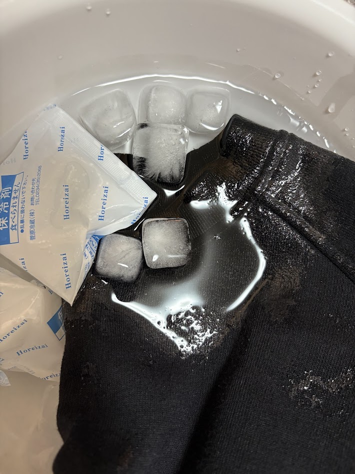 続いてスウェットのネックの部分だけを氷水の中につけていきます。ネットで見たところ大体どれも1分ぐらいつけておけば十分とのことでしたので、それに倣ってだいたい1分ほどつけてみました。