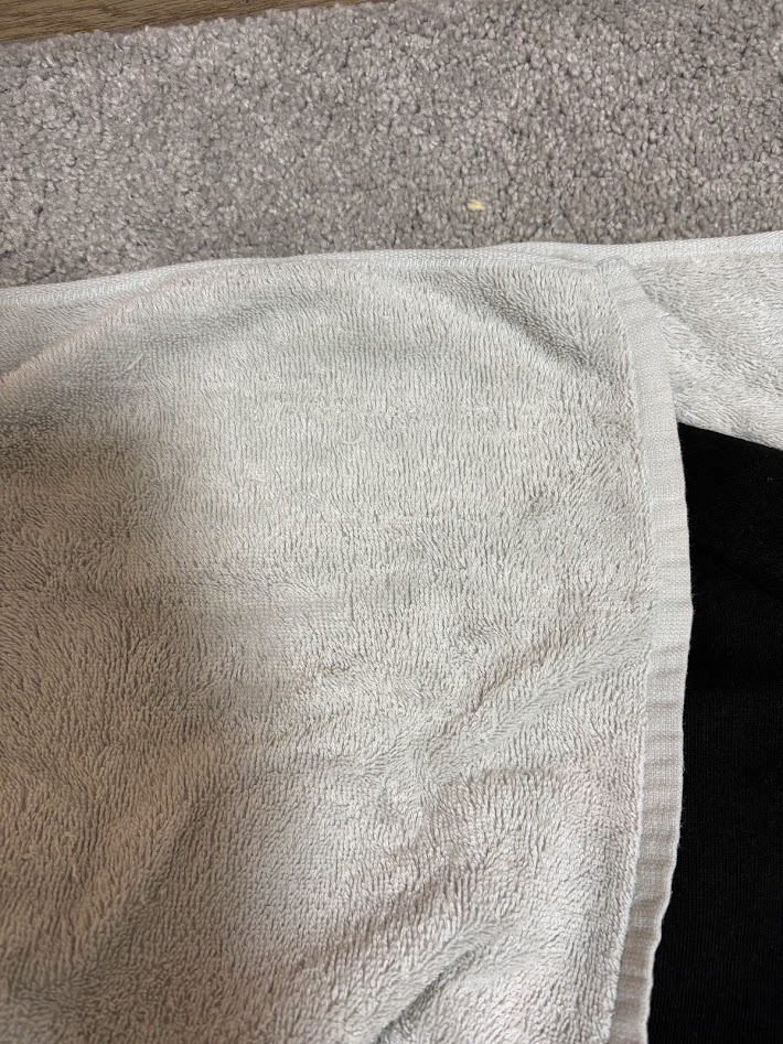 濡れている部分をまずはタオルで乾かしていきます。ここで雑にスウェットのネックを絞って水気を切ろうとしてしまうと、せっかく氷水につけてネックを引き締めたのに、またヨレヨレになってしまうので、注意して優しくタオルを使って乾かしていきます。