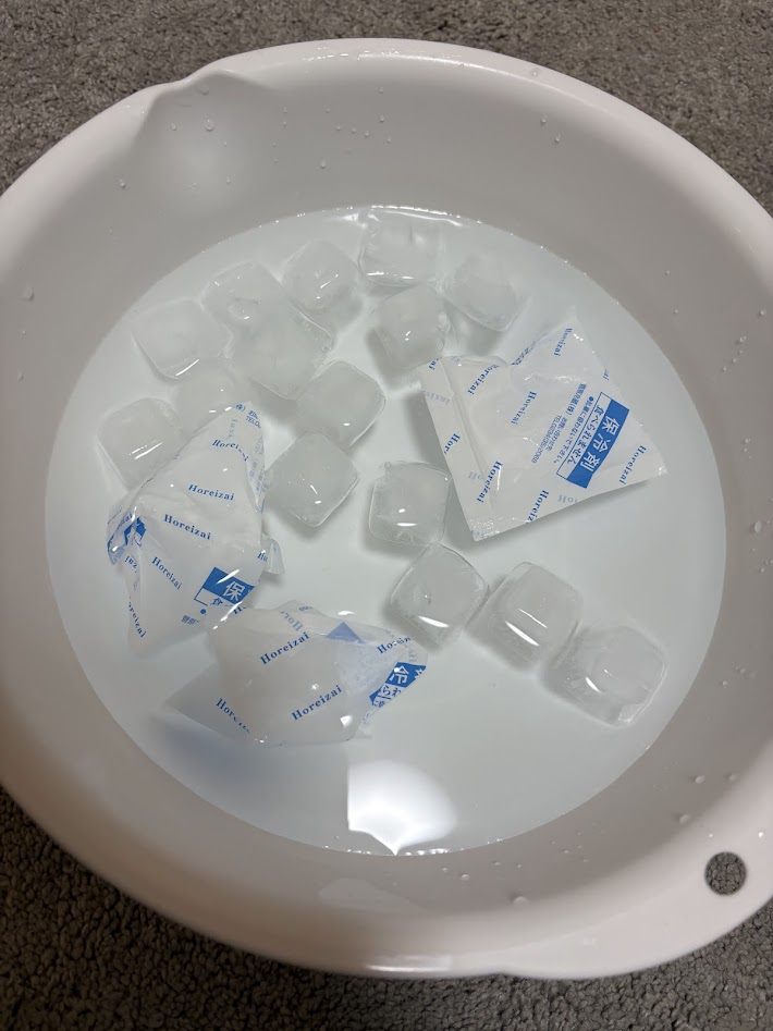 まずはスウェットの首元をつけれるぐらいのボウルを準備して、その中に氷水を準備します。